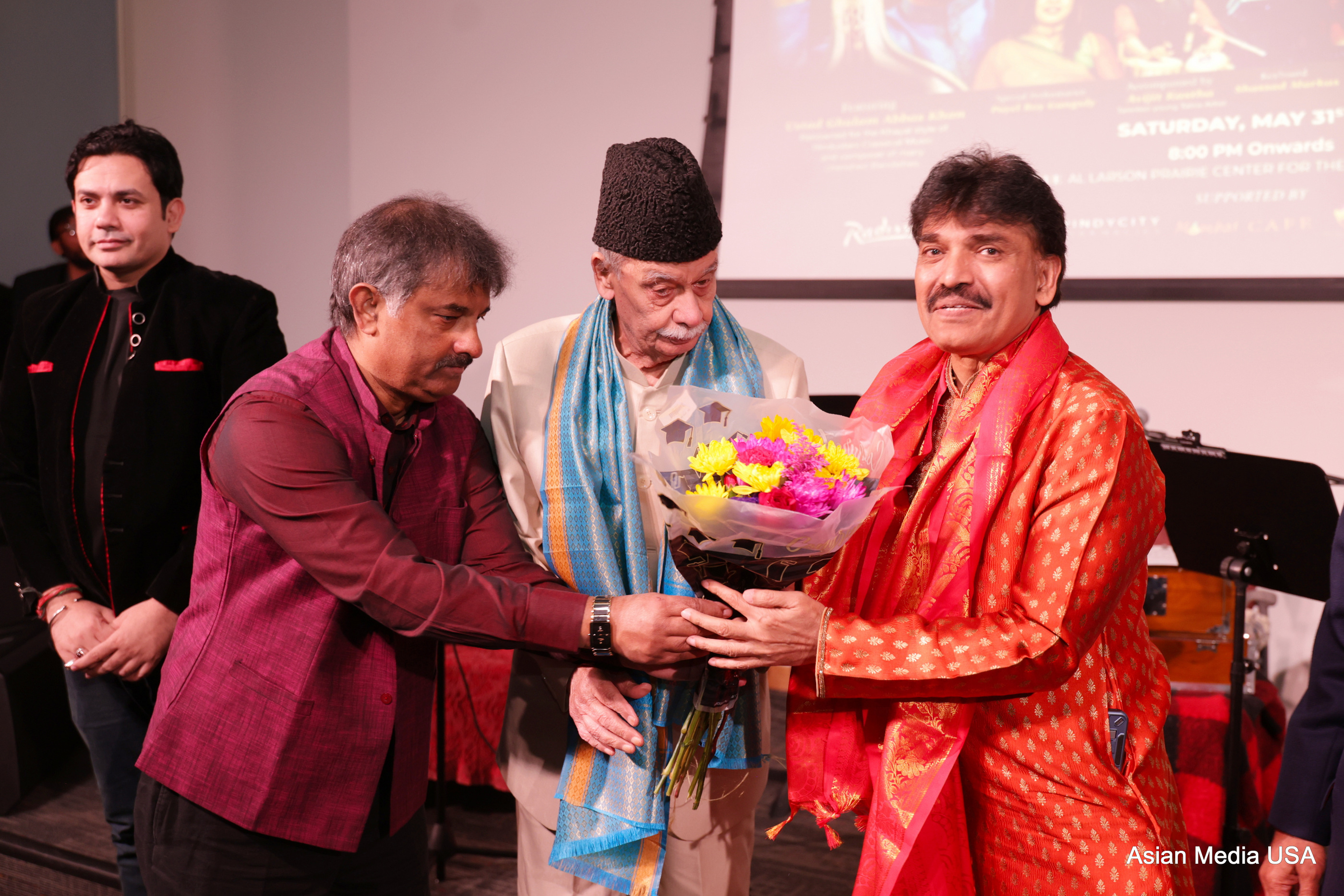 Ustad Ghulam Abbas Khan being greeted by organizers with a bouquet at the May 31 performance in Chicago.