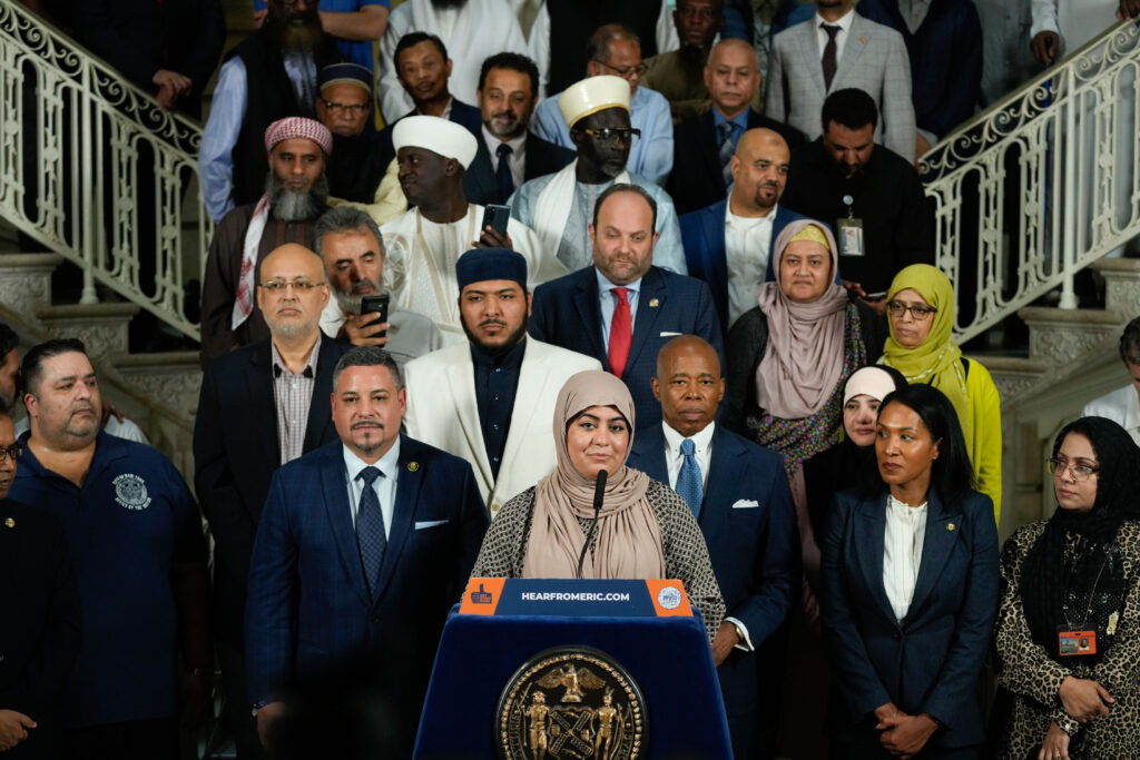 New York City Mayor Eric Adams announces a new NYPD initiative to support and facilitate the Islamic call to public prayer at regularly prescribed times each Friday and during the holy month of Ramadan, at City Hall on Tuesday, August 29, 2023. Michael Appleton/Mayoral Photography Office