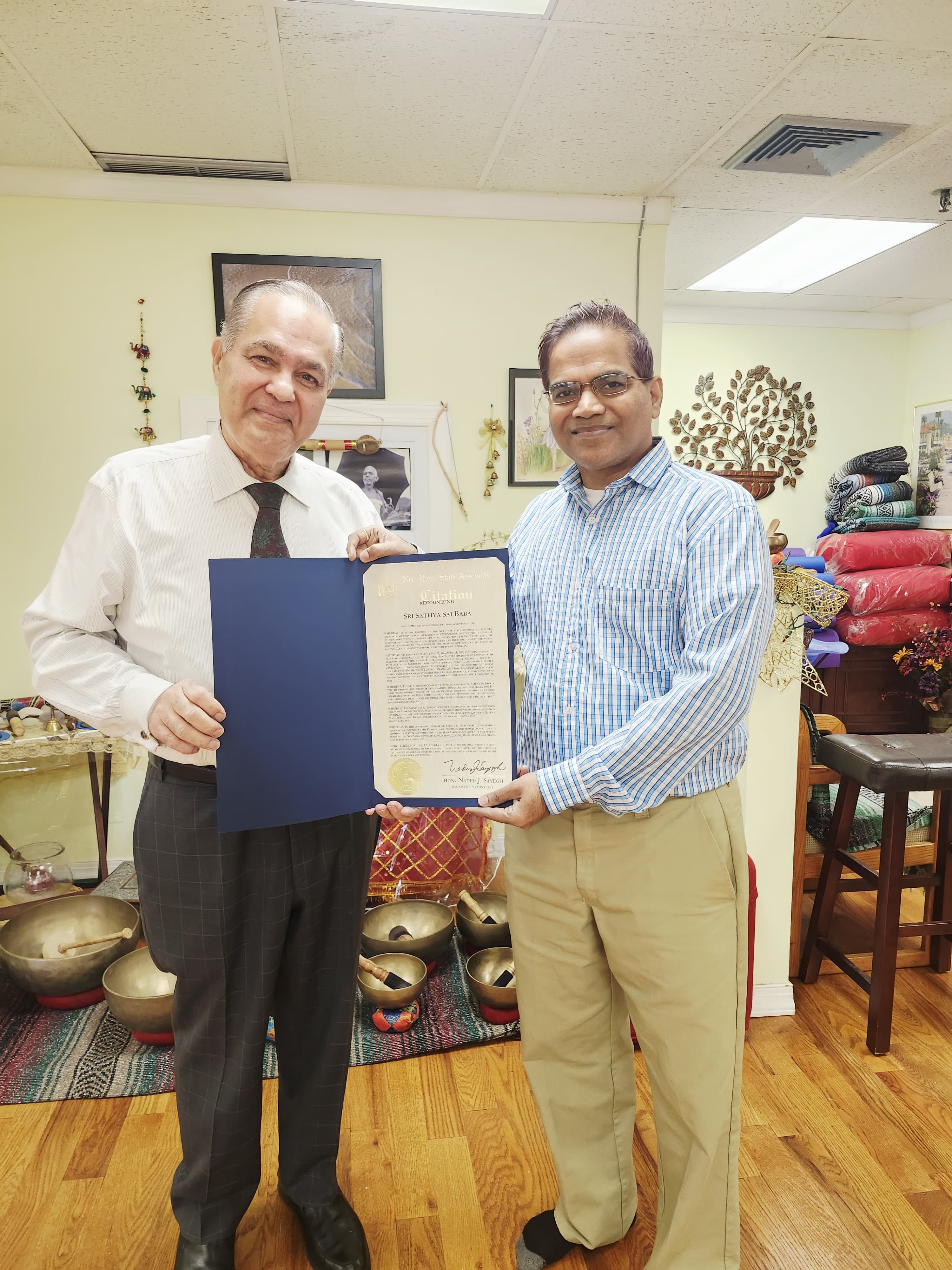 Sundar Venugopalan of the Sri Sathya Sai Global Council, who led the effort to get a citation, in his letter addressed to Assemblyman Sayegh and Rev. Chandra Sookdeo, said, “With a heart overflowing with gratitude, on behalf of the millions of practitioners of the Universal teachings of Sri Sathya Sai Baba from around the world, I wish to thank you for this New York State Assembly Citation during this centennial year of Sri Sathya Sai Baba.” Venugopalan also thanked Guruji Dileepkumar Thankappan from the World Yoga Community for his support to the Sri Sathya Sai Global Council.