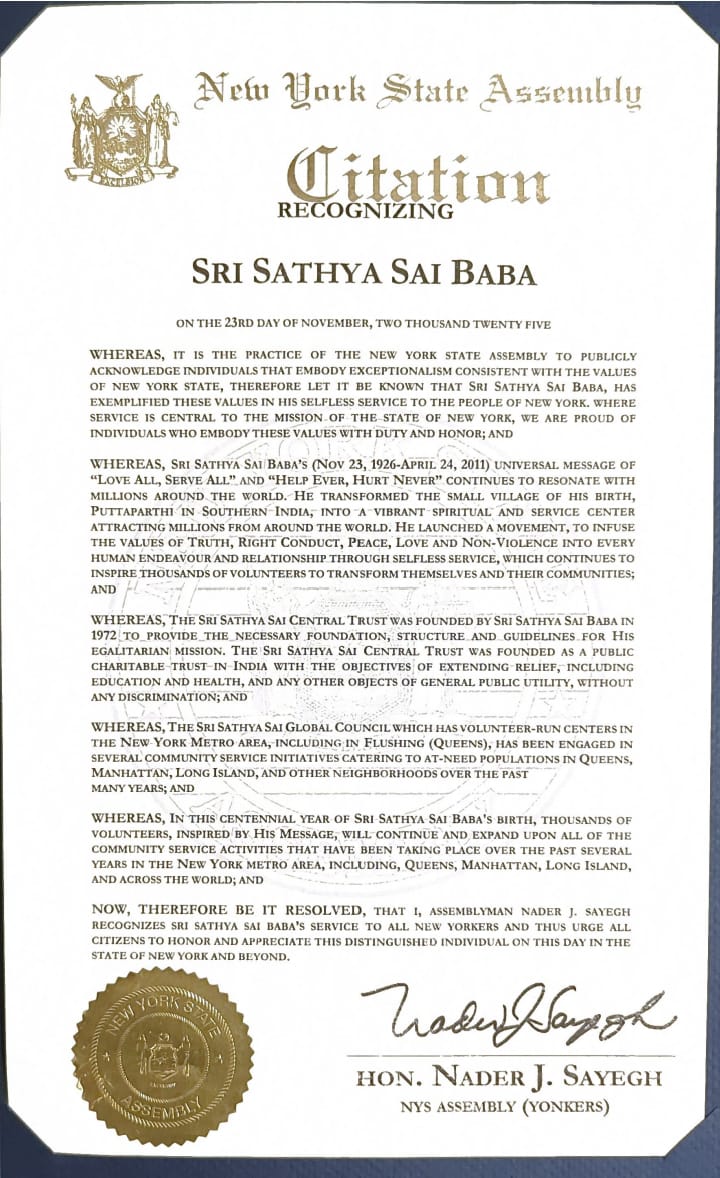 The New York State Assembly in an initiative led by Assemblyman Nader Sayegh, issued a citation November 20, honoring Sri Sathya Sai Baba and his teachings on his centennial birthday which falls on November 23, 2025.
