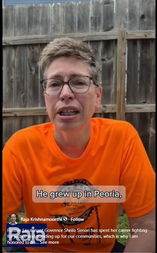 Former Lt. Governor of Illinois Sheila Simon endorsing Rep. Raja Krishnamoorthi for US Senate via a video message. PHOTO: screenshot from video